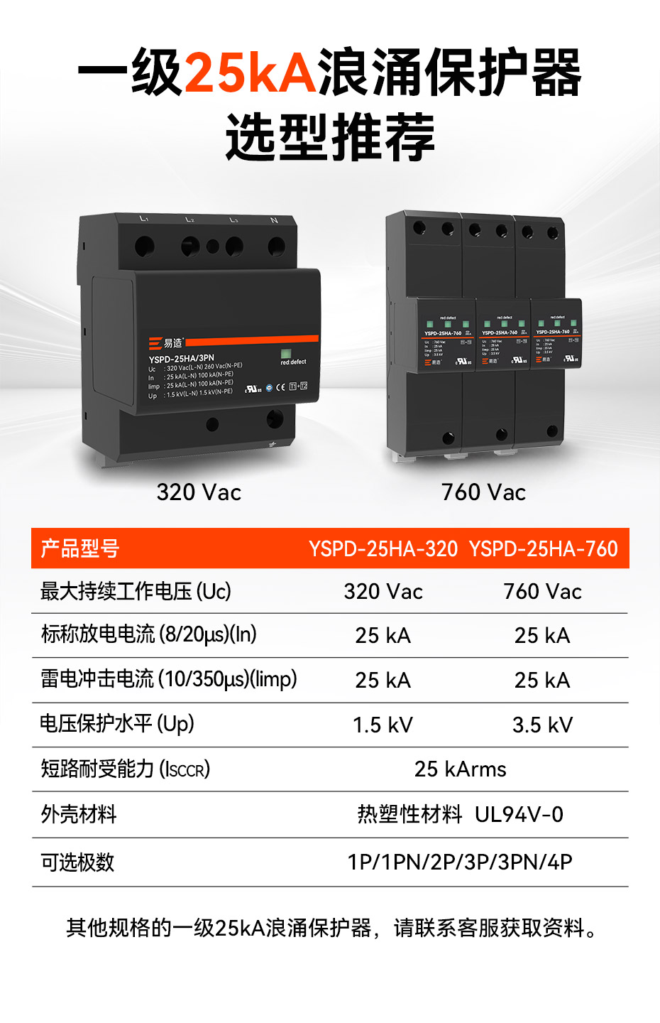 易造1+2級25kA復合型浪涌保護器安全無續流、小體積、高通流、低Up,帶故障指示遠程告警功能,維護方便,最大持續工作電壓Uc高達760Vac,可直接保護終端設備。