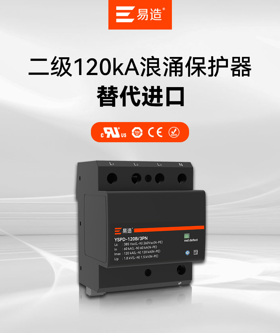 易造T2級大通流浪涌保護器,擁有UL、TUV、CE等國際質量認證,符合全球市場的最高安全和RoHS歐盟環保標準,可替代進口品牌SPD,支持出口。
