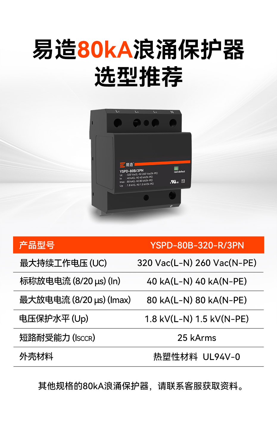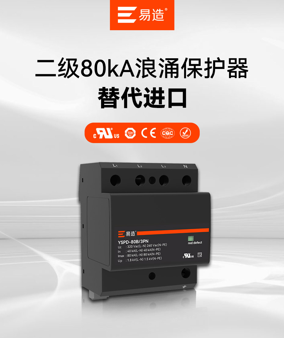 易造80kA二級浪涌保護器,小體積大通流,適用于各種供配電系統的單相和三相保護,帶本地和遠程告警功能,安裝簡單、維護方便,可用于3000米以上的高海拔地區。