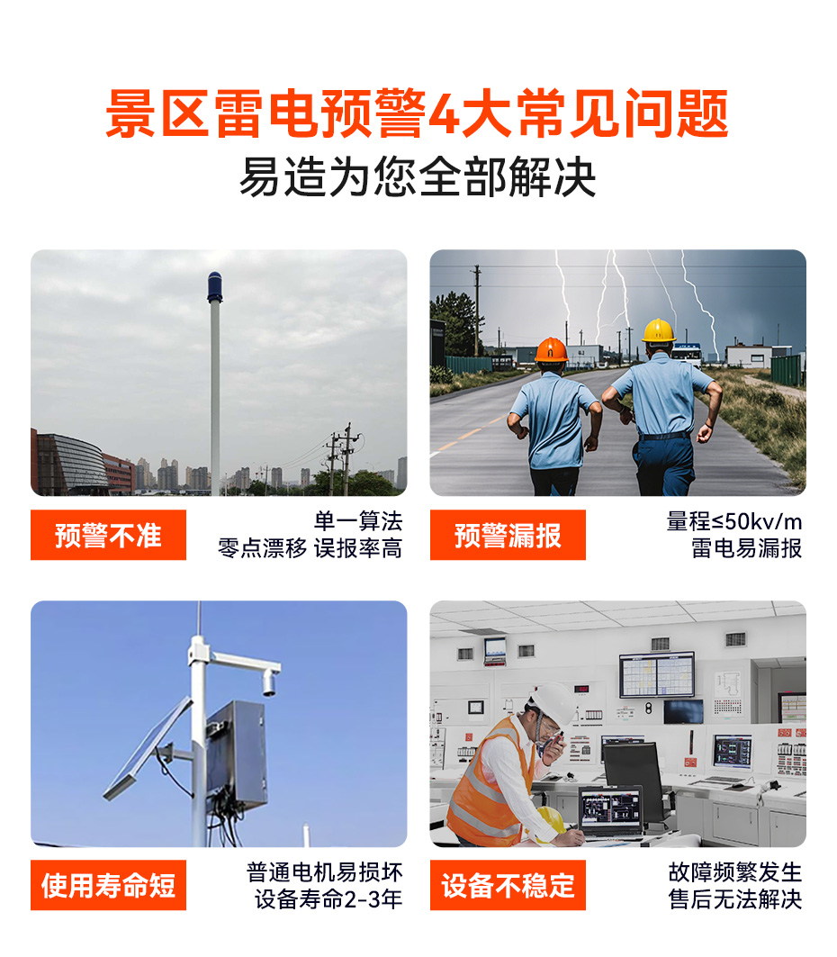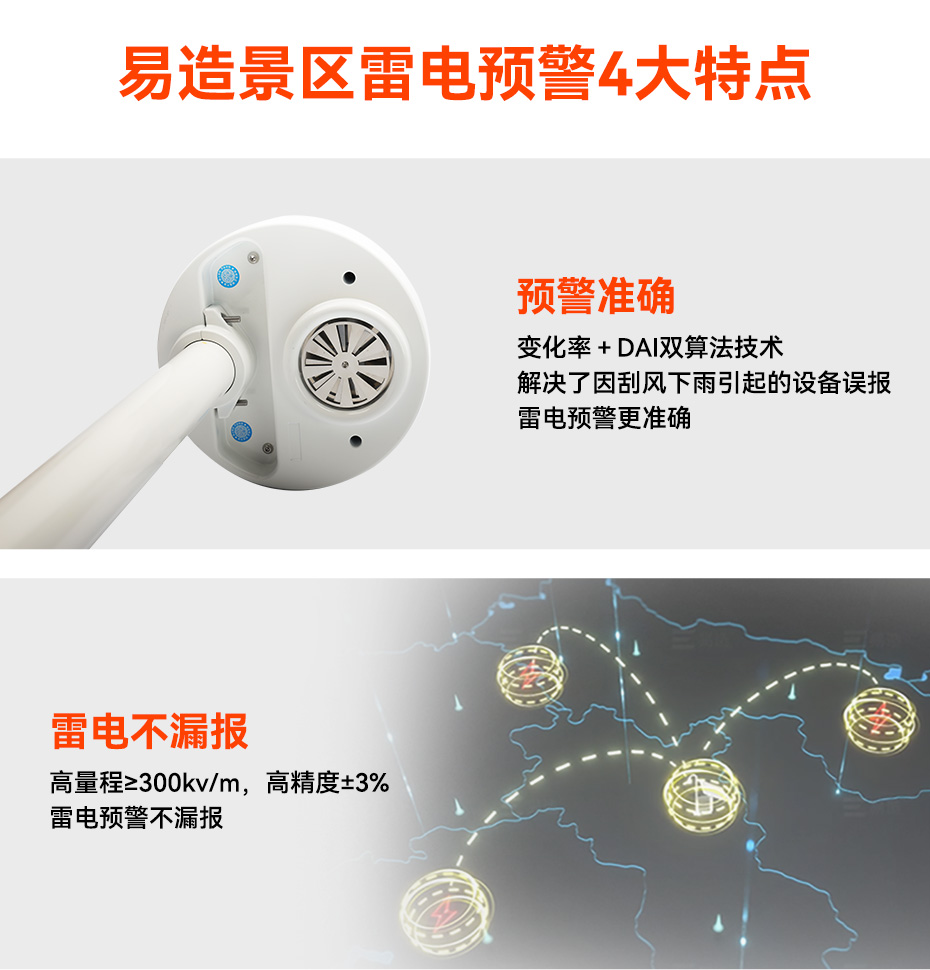 易造景區(qū)雷電預(yù)警系統(tǒng),可實(shí)時(shí)監(jiān)測(cè)景區(qū)20公里范圍內(nèi)的雷電活動(dòng),并可提前30分鐘發(fā)出黃橙紅三級(jí)雷電警報(bào),及時(shí)通知景區(qū)工作人員采取防雷應(yīng)急預(yù)案,停止索道、纜車運(yùn)行,引導(dǎo)疏散游客進(jìn)入裝設(shè)防雷裝置的建筑物內(nèi),確保游客的生命安全。IP65預(yù)警探頭具有WF2防腐等級(jí),可在各種環(huán)境條件下長(zhǎng)期穩(wěn)定運(yùn)行,使用壽命長(zhǎng)達(dá)10年以上。